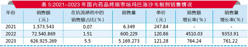 市場及銷量 PDB數據顯示,2023年國內藥品終端市場瑪巴洛沙韋制劑的銷售額為6.27億元。自2021年該產品上市以來,其銷售額和銷售量均實現了快速增長。在抗流感藥物市場中,瑪巴洛沙韋制劑的銷售額占比也呈現出大幅提升的態勢。2021年和2022年,其銷售額占比分別為0.07%和1.51%,而到了2023年,這一比例大幅提升至5.5%,在抗流感藥物中排名第三。